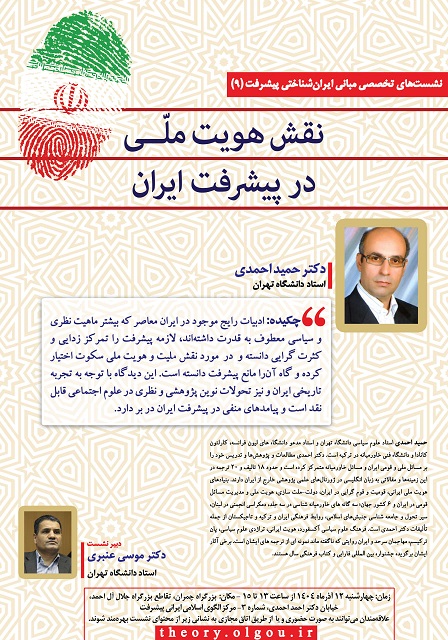 نهمین نشست مبانی ایران شناختی پیشرفت با موضوع «نقش هویت ملی در پیشرفت ایران» با سخنرانی دکتر حمید احمدی، استاد دانشگاه تهران در محل مرکز الگوی اسلامی ایرانی پیشرفت برگزار می‌شود. دبیر این نشست تخصصی دکتر موسی عنبری، استاد دانشگاه تهران است.