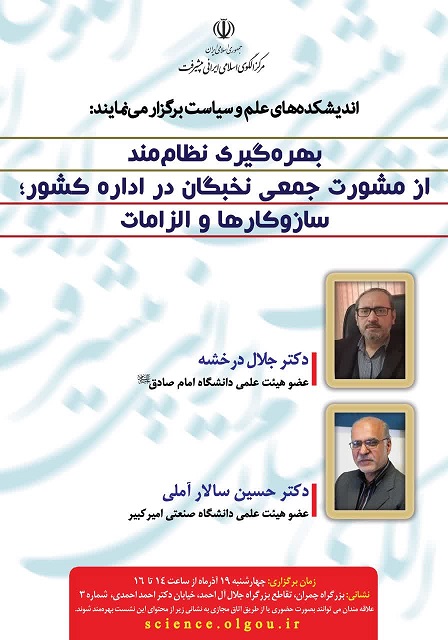 اندیشکده‌های علم و سیاست الگوی اسلامی ایرانی پیشرفت در نشستی مشترک به بررسی موضوع "بهره‌گیری نظام‌مند از مشورت جمعی نخبگان در اداره کشور؛سازوکارها و الزمات" در جمع اعضای دو اندیشکده و جمعی از صاحبنظران این حوزه می‌پردازند.