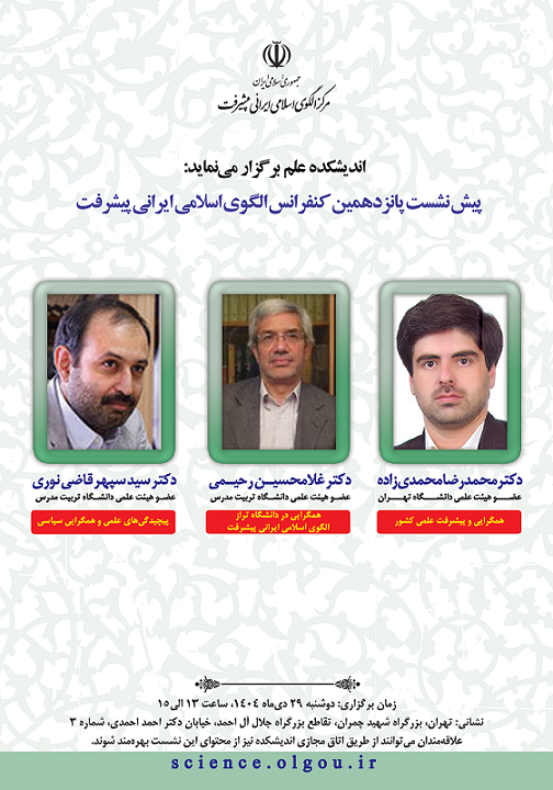 در این نشست آقایان دکتر سپهر قاضی نوری عضو اندیشکده علم الگوی اسلامی ایرانی پیشرفت و استاد دانشگاه تهران، دکتر علامحسین رحیمی عضو اندیشکده علم و استاد دانشگاه تربیت مدرس و دکتر محمدرضا محمدی زاده عضو اندیشکده علم و استاد دانشگاه تهران به سخنرانی می‌پردازند. این نشست در جمع اعضای اندیشکده علم الگوی اسلامی ایرانی پیشرفت و جمعی از اساتید،کارشناسان مرکز الگوی اسلامی ایرانی پیشرفت و علاقه‌مندان این حوزه برگزار می‌شود.
